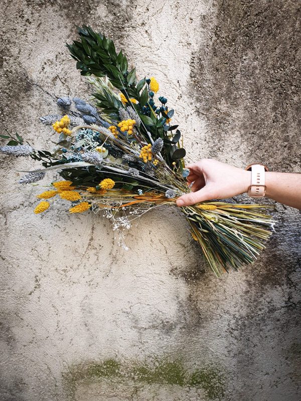 Ram de flor seca en tons verds, naturals, blaus, mostassa i grocs. El tipus de flor pot variar segons l’estoc.